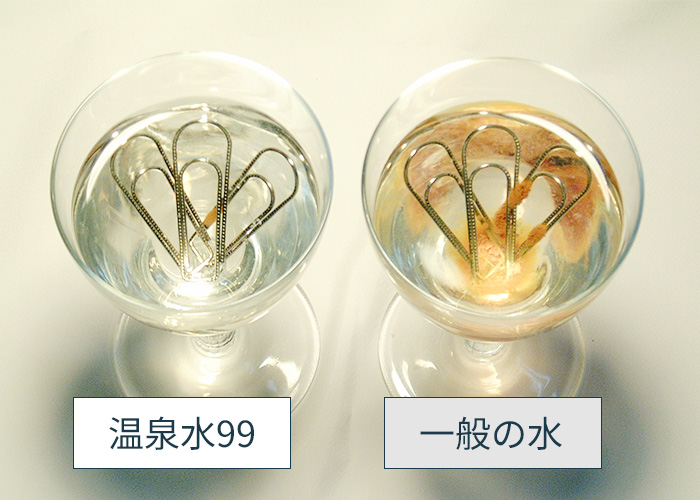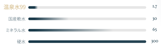 一般的な水がpH7前後の中性であるのに対し、温泉水99はpH9.5〜9.9のアルカリ性。